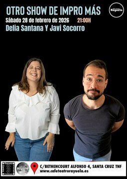 Eine Impro-Show. Wo sie improvisieren. Wo die Leute lachen, weil es Impro ist (hoffentlich). Das Wort „Impro“ wird oft gesagt. Die Leute können uns Dinge zurufen. (Weil es Impro ist). Magst du Impro-Shows? Komm vorbei, denn in dieser Show gibt es viel Impro. Javi Socorro macht Impro. Delia Santana macht auch Impro. Also sagten die beiden zueinander: „Hey, wie wäre es, wenn wir eine Impro-Show machen?“ Sie sahen sich an, es gab eine Verbindung und den Impuls, sich (improvisiert) zu küssen. Aber beide sind mit ihren jeweiligen Partnern glücklich.